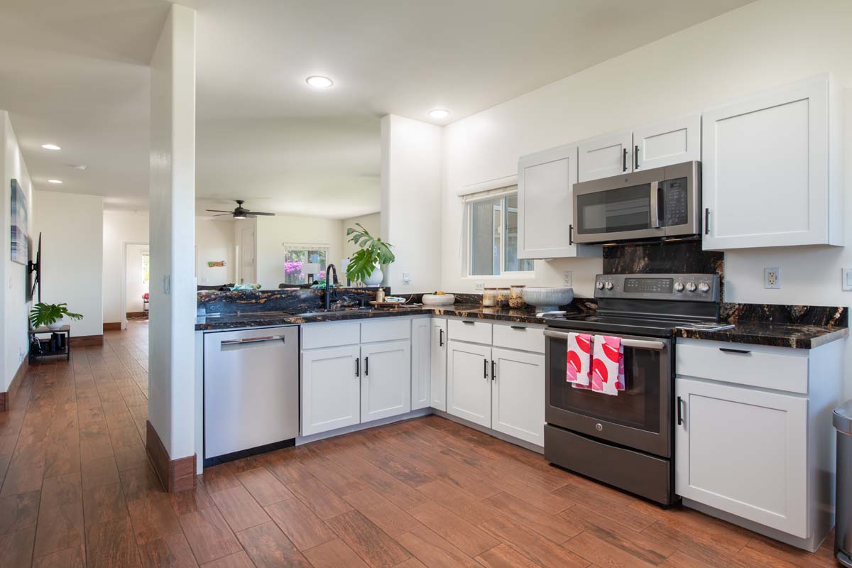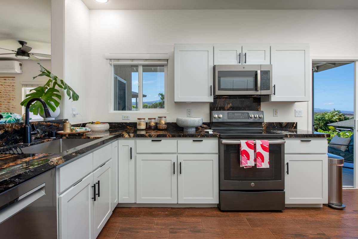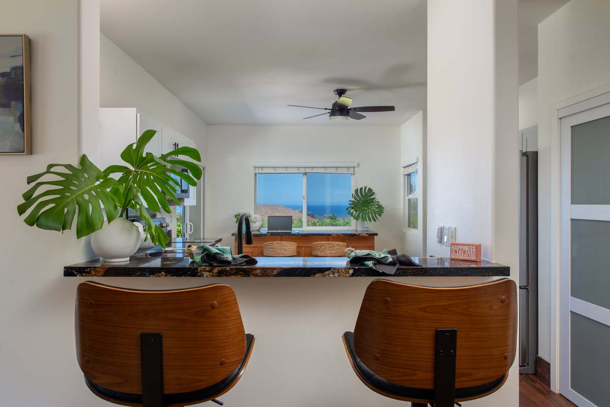The kitchen is the heart of the home, featuring Magma Black granite counters, modern appliances, an expanded pantry, and a new breakfast bar with storage—all perfectly positioned to take in ocean views, creating an easy indoor-outdoor flow.