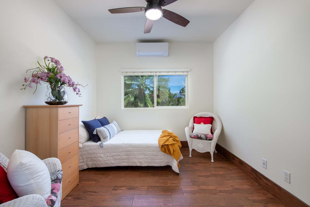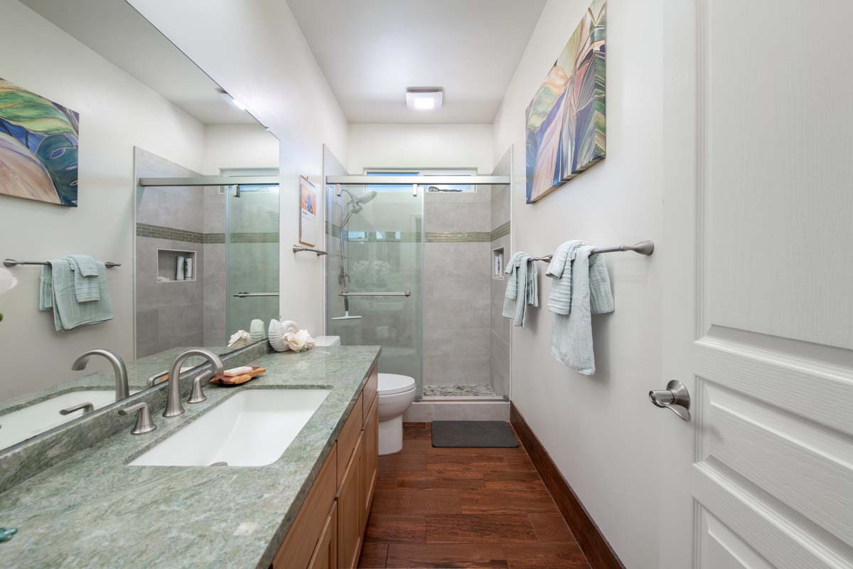 The primary suite is private and light-filled, with ocean views, a private lanai, dual vanities, a walk-in shower, and a generous walk-in closet. Both bathrooms have been upgraded with Costa Smeralda green granite and tiled walk-in showers.