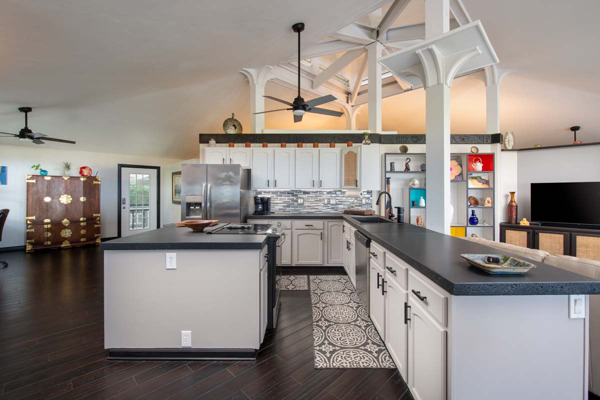 Expansive covered lanais on both the upper and lower levels invite you to relax, entertain, and enjoy cooling trade winds and ocean views year-round. A distinctive central cupola was thoughtfully designed to enhance natural airflow throughout the main living areas. The kitchen sits at the heart of the home, offering ample space for cooking, gathering, and entertaining. The main level upstairs features three bedrooms and two full baths, providing a functional and comfortable layout for daily living.